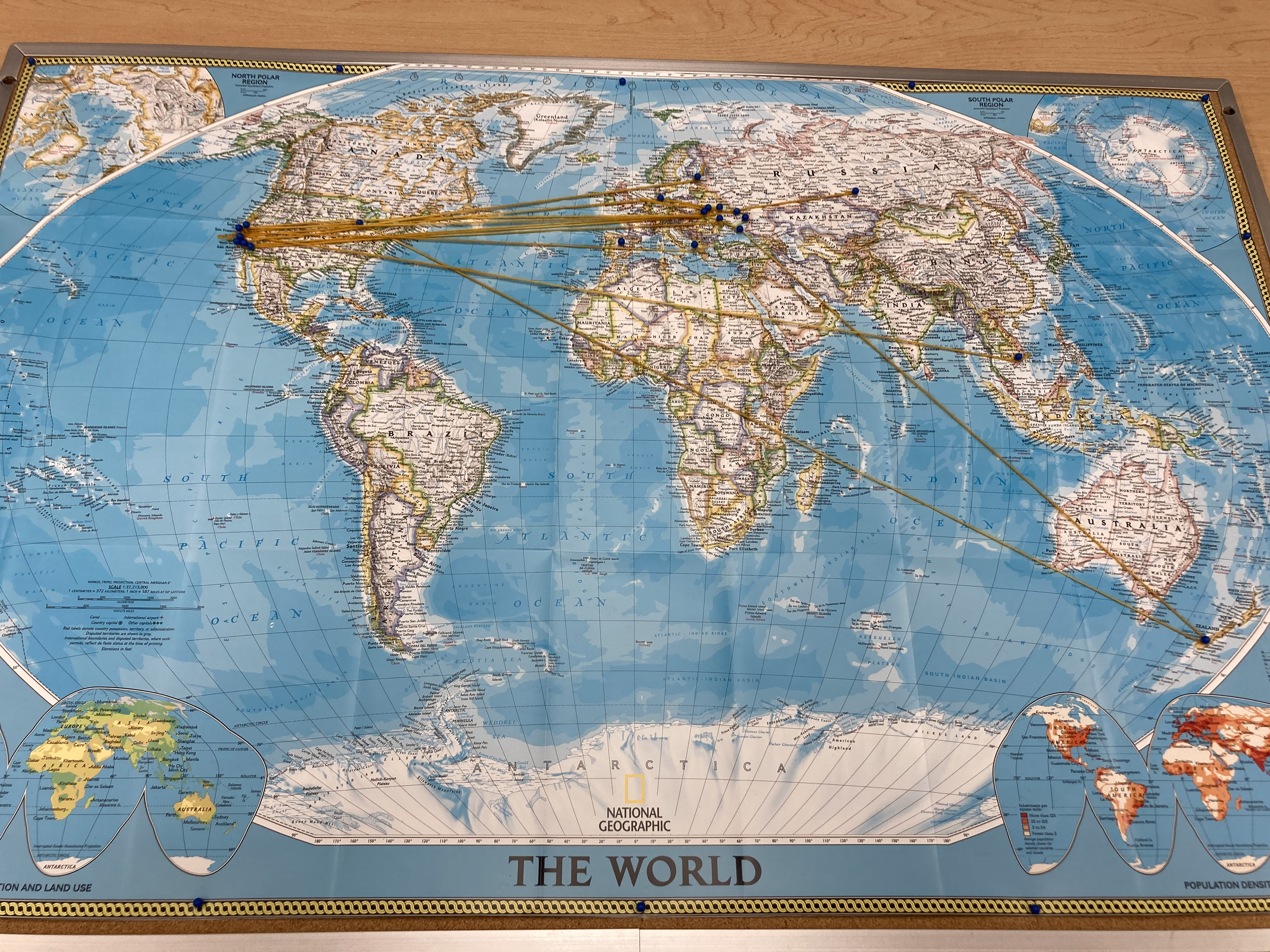In another fun group activity, we asked volunteers to use this map to pin and connect the most important places on their life path, such as where they lived, worked, or studied.